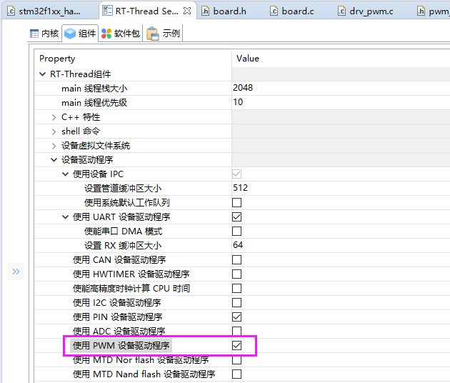 - STEP 1:RT-Thread Settings 中打开 PWM 驱动支持。
