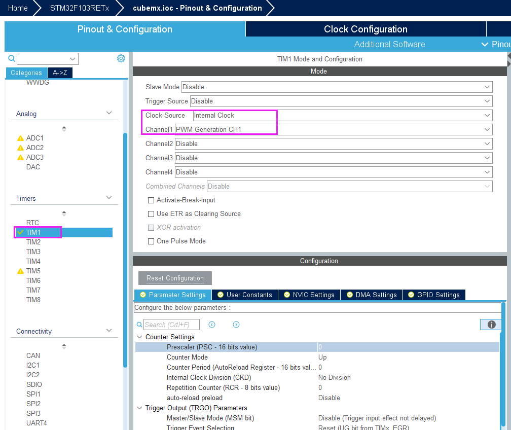 /** if you want to use pwm you can use the following instructions. * * STEP 1, open pwm driver framework support in the RT-Thread Settings file * * STEP 2, define macro related to the pwm * such as #define BSP_USING_PWM1 * * STEP 3, copy your pwm timer init function from stm32xxxx_hal_msp.c generated by stm32cubemx to the end if board.c file * such as void HAL_TIM_Base_MspInit(TIM_HandleTypeDef* htim_base) and * void HAL_TIM_MspPostInit(TIM_HandleTypeDef* htim) * * STEP 4, modify your stm32xxxx_hal_config.h file to support pwm peripherals. define macro related to the peripherals * such as #define HAL_TIM_MODULE_ENABLED * */ /*#define BSP_USING_PWM1*/ /*#define BSP_USING_PWM2*/ /*#define BSP_USING_PWM3*/ #define BSP_USING_PWM1 #define BSP_USING_PWM1_CH1下面是源码中对 “BSP_USING_PWM1_CH1” 的使用: