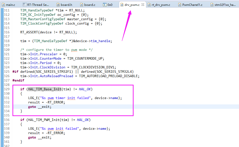 - 当使用 pwm 设备时,rtt 会在 stm32_hw_pwm_init 函数中,初始化对应的 Timer 不需要用户单独去初始化。